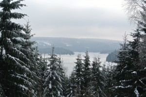 Druhou část přehrady jsem přešla s běžkami v rukách, protože bylo málo sněhu. A jet se muselo po chodníčku, kde bylo cca třicet centimetrů široká trať, pak hned zábradlí, které vyčnívalo nad trať jen patnáct centimetrů a hned za ním šikmý sešup do vody. Jela jsem to ráno a málem jsem si stříkla do textilu, a už ráno jsem si slíbila, že je to naposledy.